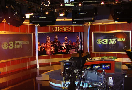 Paul Hicks, the in house lighting designer at KYW-TV, chose to light the studio with the new Videssence Power Key Series 220 watt fixtures. The patented “POWER KEY” luminaires, are the only focusable fluorescent fixtures in the world. A simple adjustment mechanism moves the lamp placement within the fixture allowing for easy field adjustments from 60° thru 90° Beam Spread. In conjunction with quarts for back lighting, Mr. Hicks used all dimmable Power Key #P220-455BX fixtures for key and fill lighting for the anchor desk, the chromakey wall, the interview set and the weather center. |